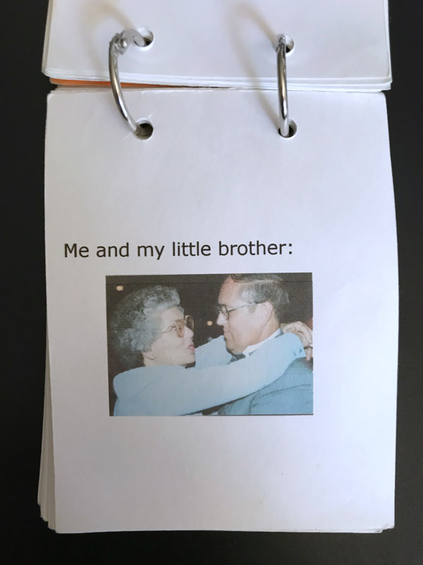 We looked everywhere, we thought. The memory wallet made for Jenny/Guppy could not be found. Today it was found! Made based on a book about how to help Alzheimer’s patients remember their life, loved ones, and things that are important. Becky and Janet worked on the contents and then Becky laid out and assembled the wallet. Here are images of the pages. It gives a wonderful view of her life, what was important to her, and family.