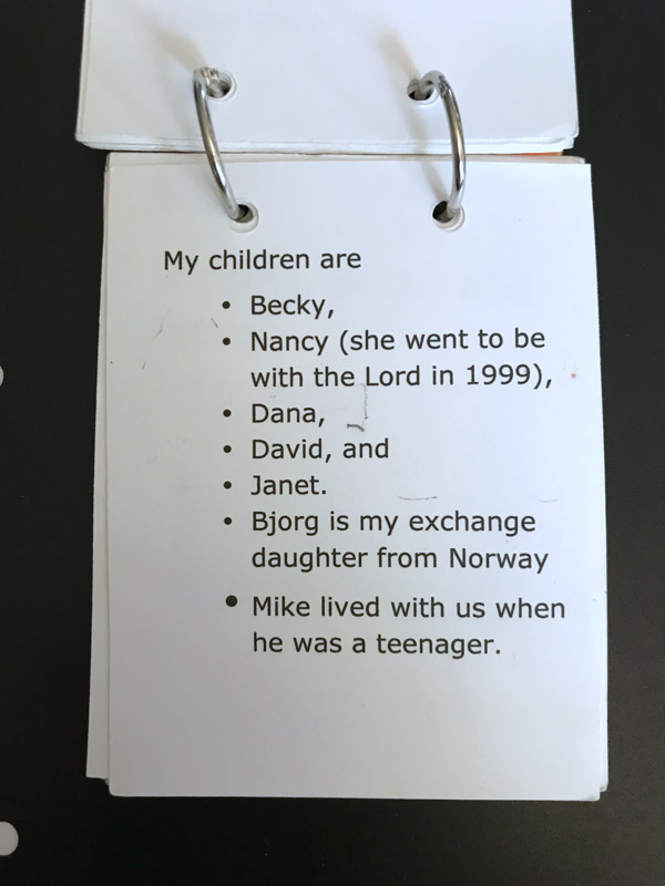 We looked everywhere, we thought. The memory wallet made for Jenny/Guppy could not be found. Today it was found! Made based on a book about how to help Alzheimer’s patients remember their life, loved ones, and things that are important. Becky and Janet worked on the contents and then Becky laid out and assembled the wallet. Here are images of the pages. It gives a wonderful view of her life, what was important to her, and family.