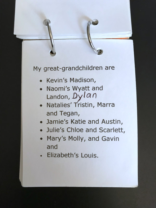 We looked everywhere, we thought. The memory wallet made for Jenny/Guppy could not be found. Today it was found! Made based on a book about how to help Alzheimer’s patients remember their life, loved ones, and things that are important. Becky and Janet worked on the contents and then Becky laid out and assembled the wallet. Here are images of the pages. It gives a wonderful view of her life, what was important to her, and family.