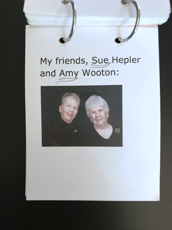We looked everywhere, we thought. The memory wallet made for Jenny/Guppy could not be found. Today it was found! Made based on a book about how to help Alzheimer’s patients remember their life, loved ones, and things that are important. Becky and Janet worked on the contents and then Becky laid out and assembled the wallet. Here are images of the pages. It gives a wonderful view of her life, what was important to her, and family.